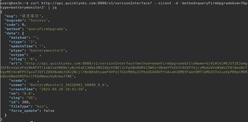 curl http://api.quicklynks.com:8080/v1/versionInterface? -d 'method=queryFirmUpgrade&vm=8&ptype=batterymonitor2'
