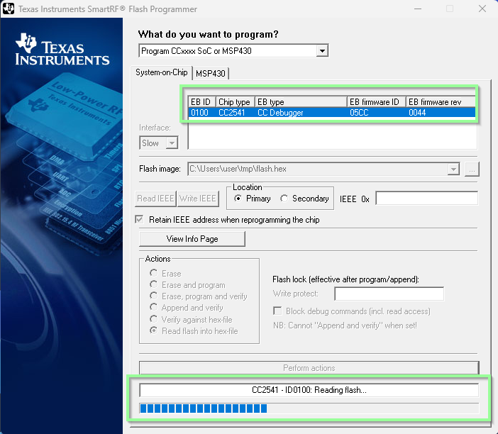 Using the older version of Smart-RF Studio, the CC2541 is detected and the flash can be dumped out of the device: