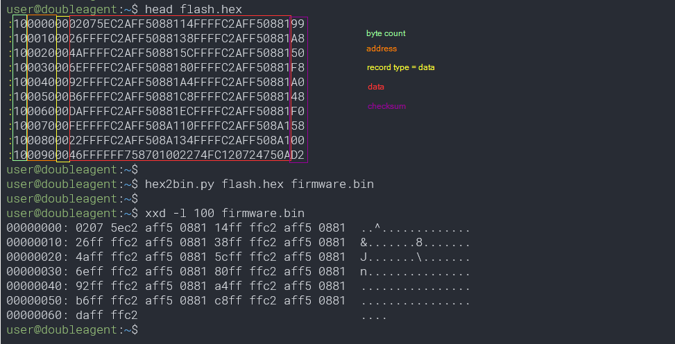 Intel Hex is a simple format using ASCII encoding. I have marked it’s format for readability: