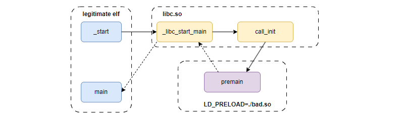 The job of the dynamic (run-time) linker is figure out what libraries need to be loaded and to link them into the executable at run time. It resolves symbols (such as function names) in shared libraries and performing the necessary relocations (e.g. "this function is at this address"). The environment variable LD_PRELOAD tells the dynamic linker to load a shared object of our choosing, rather then one found in the default paths. If that shared object exports the function with the same name, as another that exits, the LD_PRELOAD will take preference. This also applies for "constructor" directives with gcc and clang. Abuse of LD_PRELOAD is an age old technique employed in user space rootkits often to backdoor libc functions and is particularly easy to detect.