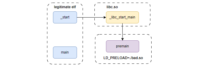 premain to mean the malicious code that replaces the original main.The start_main approach